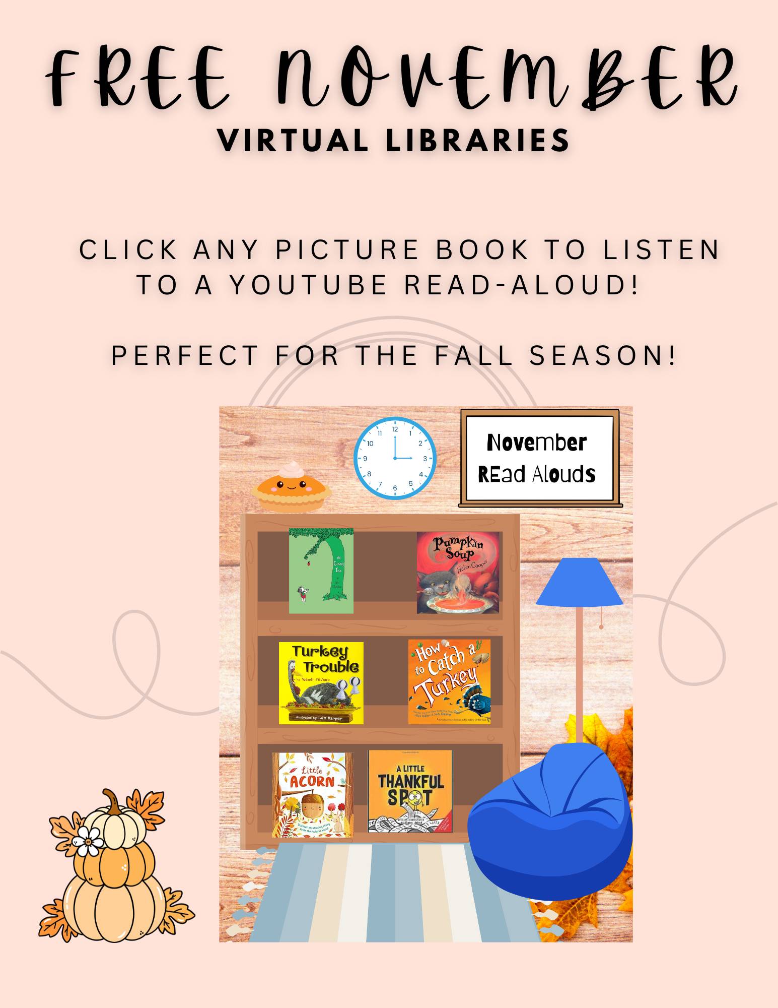 Welcome! Grab your FREE November Virtual Library Read-Aloud Page and bring seasonal storytelling straight to your students. This digital library shelf features 6 November-themed children’s books, each linked to a safe YouTube read-aloud video your class can enjoy instantly.